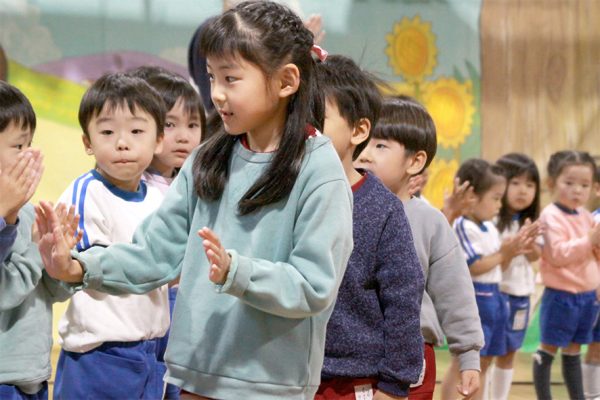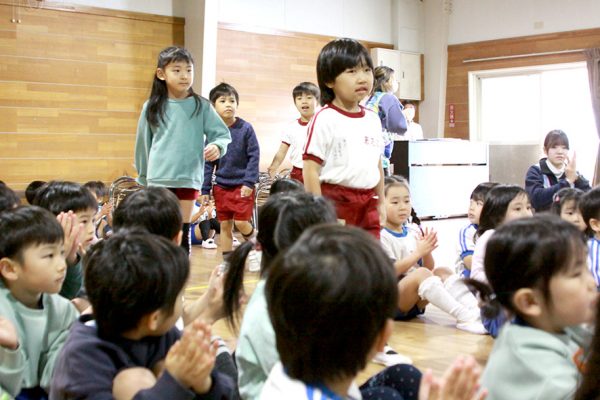 年中・年少・たんぽぽ組さんと交流し、年長さんへプレゼントが
